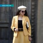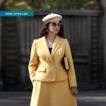 کت و دامن به‌صورت تمام آستر و تمام لایی دوخته شده‌اند تا ایستایی زیبا و فرم شیکی روی بدن داشته باشند. رنگ زرد پاییزی گرم و دل‌نشین آن، حس طراوت و انرژی فصل را تداعی می‌کند و جلوه‌ای خاص به استایل شما می‌بخشد.