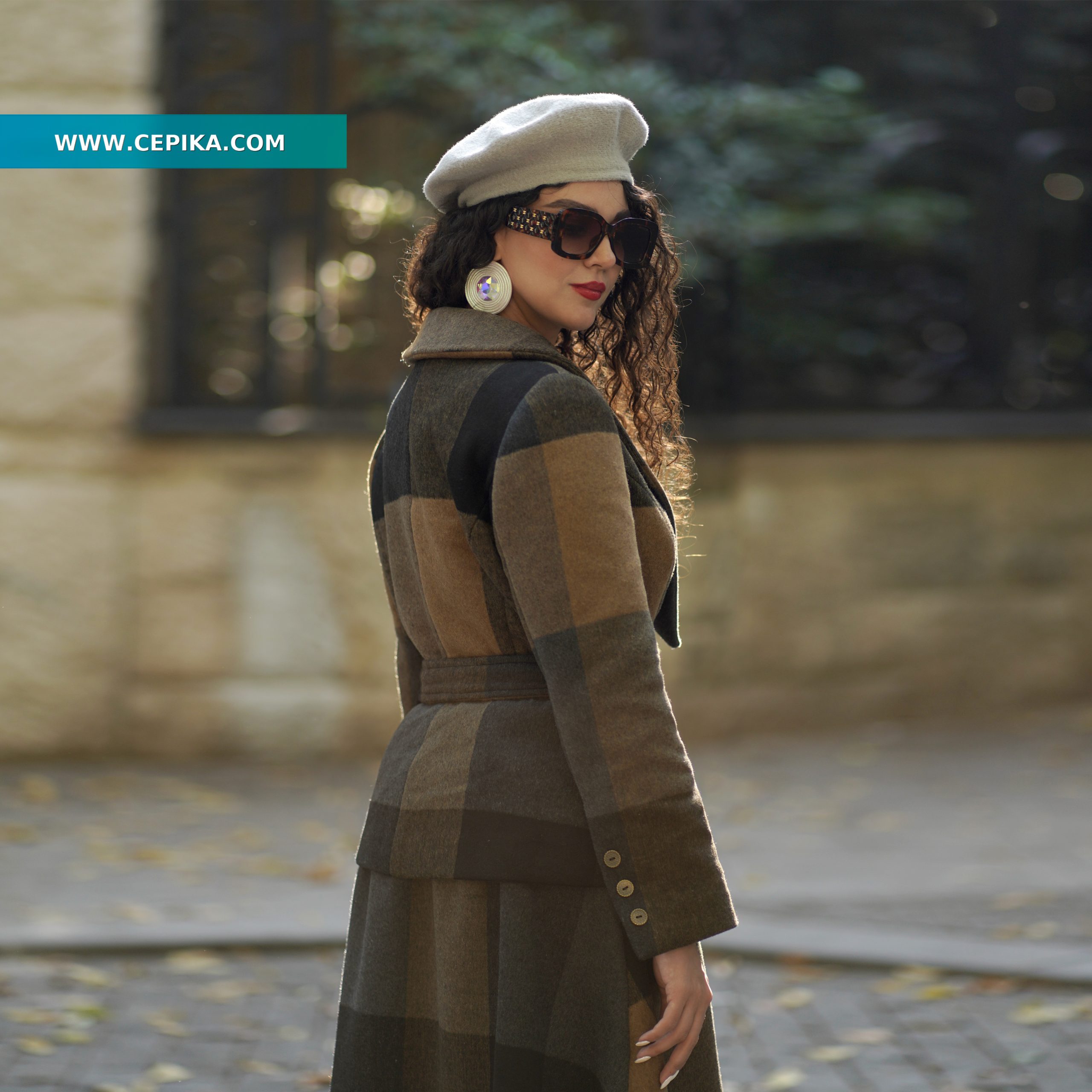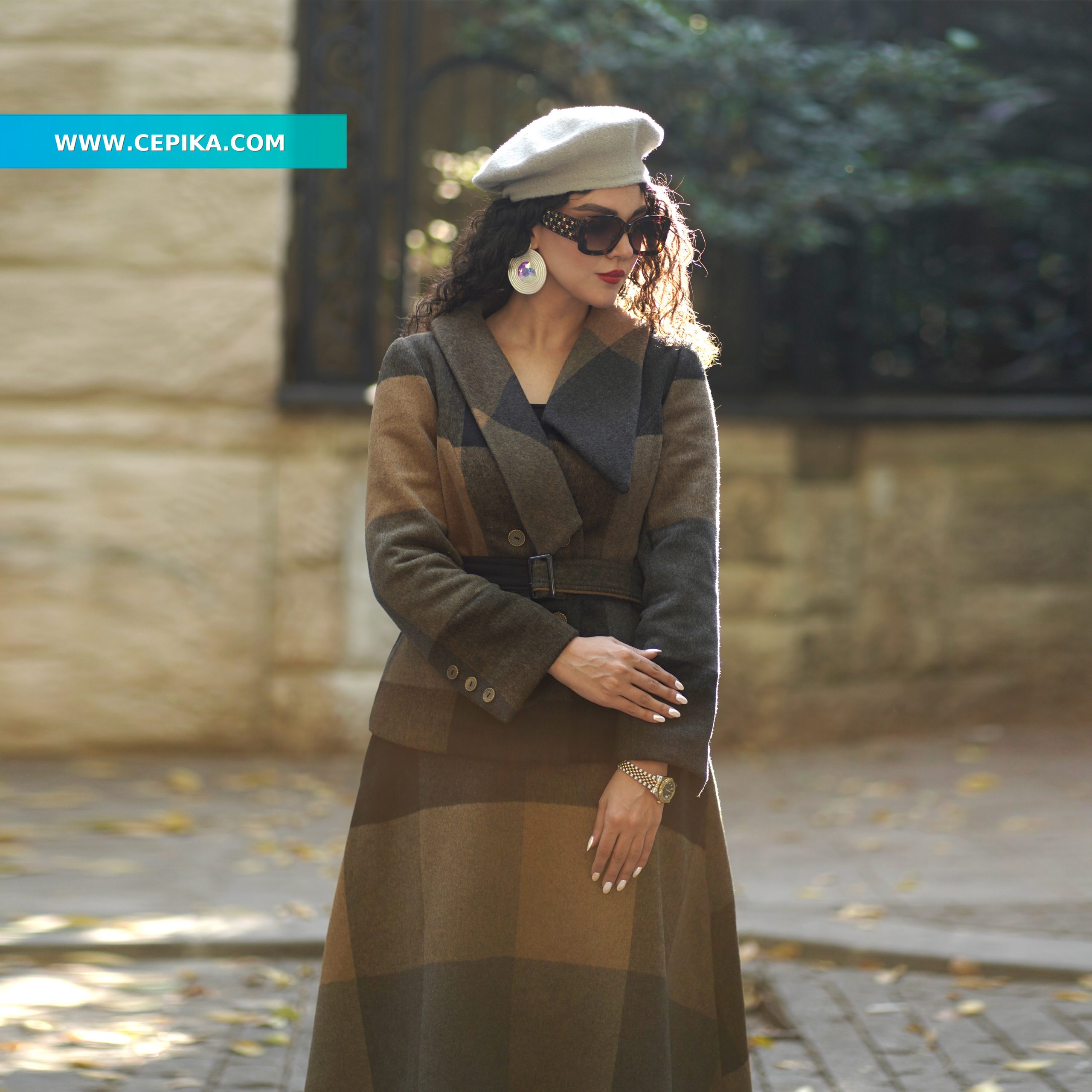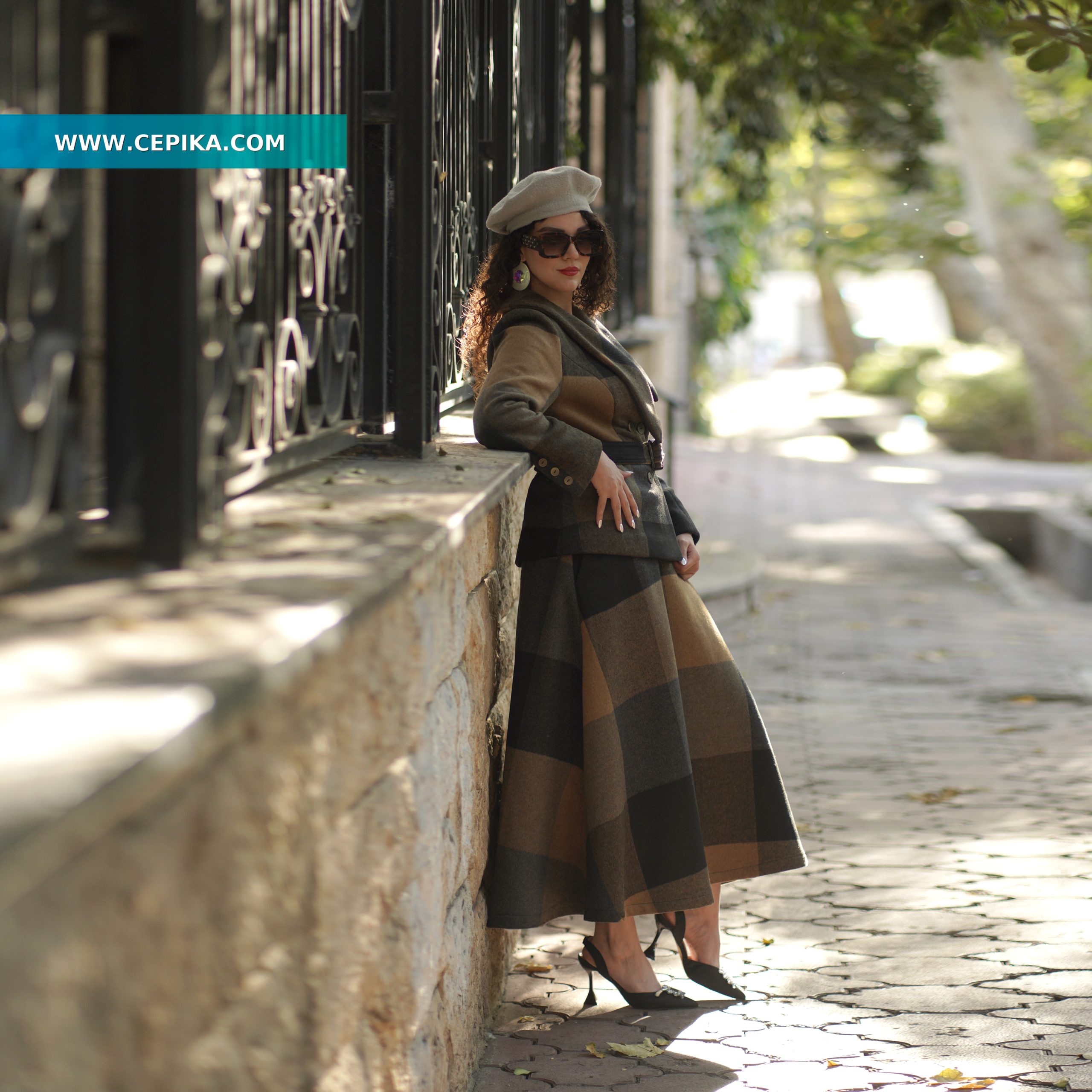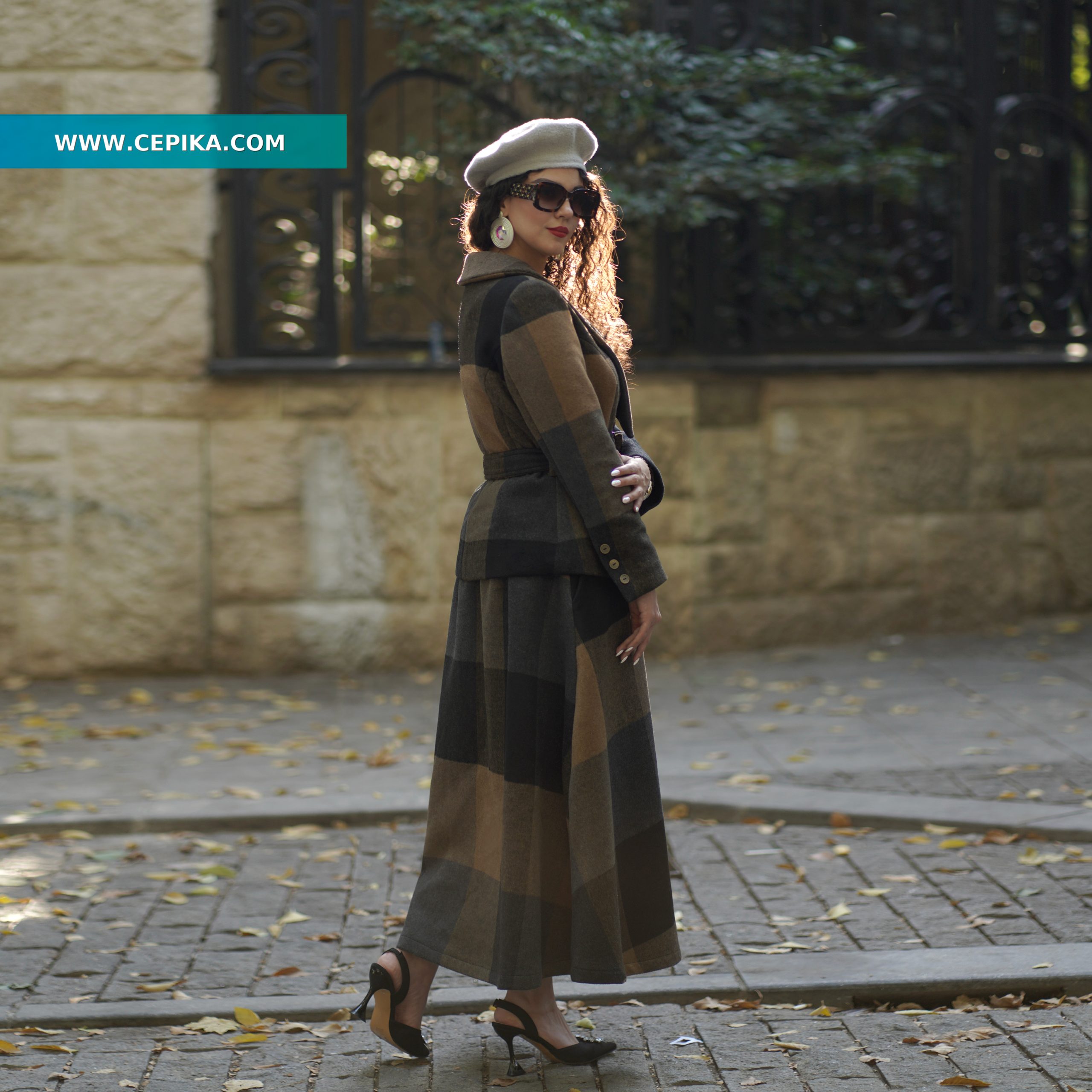 کت و دامن چهارخونه با طراحی خاص و یقه پهن شیک، الهام‌گرفته از استایل اصیل انگلیسی است؛ ترکیبی از وقار و اعتمادبه‌نفس زنانه.
